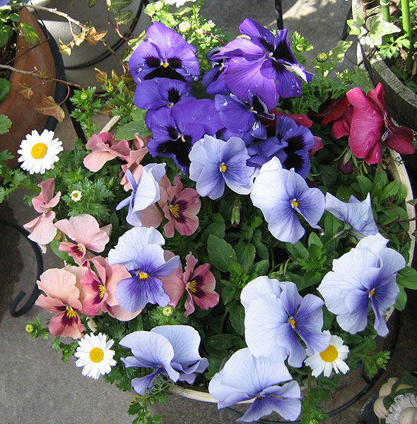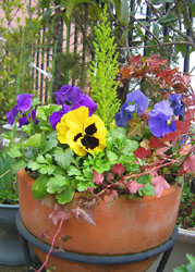 | パンジーは 匍匐性があるので、 冬の間に 短く切りつめると 脇芽がたくさん出て 春には花でいっぱいになる というので 試しに一鉢、切りつめました。 そのせいで、冬の間は 少しさみしい花壇でした。 ←こちらは切りつめなかった鉢 ↑は切りつめた鉢 |