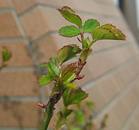 | 東側のベランダに移動した ピエール・ドゥ・ロンサール 日当たりがいいので若葉が どんどん増えています。 |