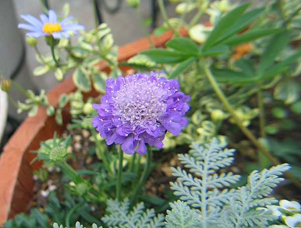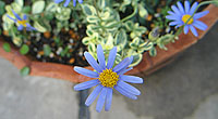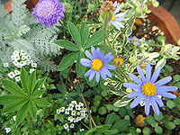 4月1日 班入葉ブルーデージーと スカビオサとルピナスなどを 寄せ植えにしました。 |