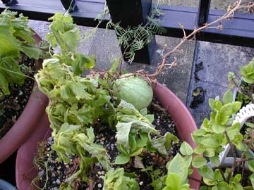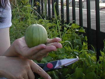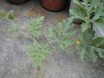 ある時、鉢の間をかき分けてみると、なんと小さなすいかができていました。