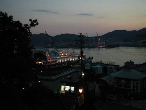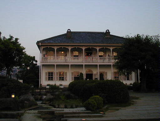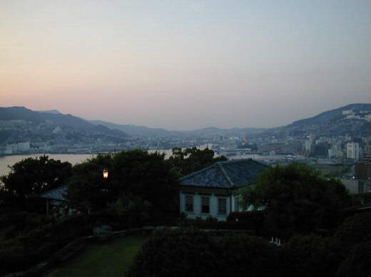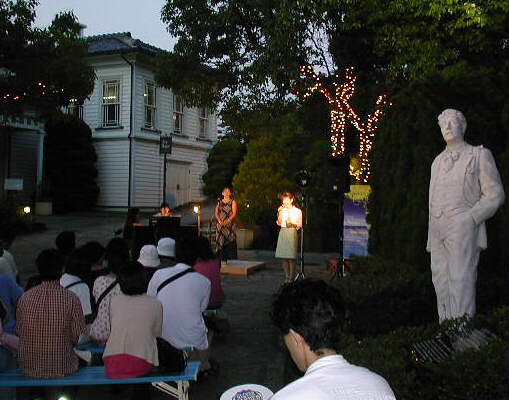 実は、ちょうどファンタスティック・ナイト2000というイベントの最中で、10月9日まで夜9時半まで開演しています。グラバー園には5時頃ついたのですが、夜景を撮ろうとずっと時間をつぶしました。また、マダム・バタフライ2000というコンサートをやっています。10月7日まで金曜と土曜の夜にダニエラ・ヴァラデスクさんというソプラノ歌手の方が7時頃から2回コンサートをやっています。蝶々夫人の中の曲を歌っていました。グラバー園の中庭で、蝉しぐれの中、素敵なオペラの曲を聴くことができて感動しました。写真に写っている白い像の人はプッチーニだそうです。