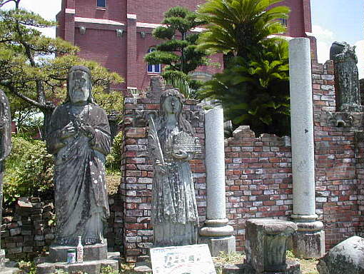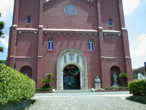 平和公園から浦上天主堂に向かう途中、階段のところから浦上天主堂が見えました。近くから撮った写真ですが、大きすぎて全部写りませんでした。原爆が落ちたときの像や壁も残してありました。