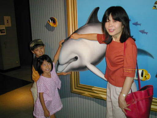 東京タワーの中にあるトリックアート館に行きました。子どもたちどころか大人にも大受けでした。予想以上におもしろい体験ができました。例えば、何でもない鏡の部屋と思ったら、実は家具などがあたかも鏡に映っているように置かれてありました。びっくりしてしまいました。なんといってもイルカの絵がすごいです。その場で見ても立体感がありましたが、写真にするとほんとうに飛び出しているようです。