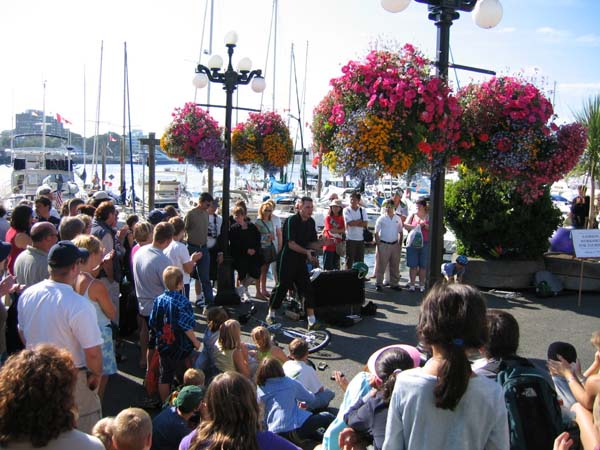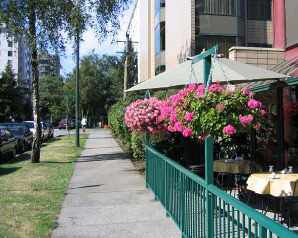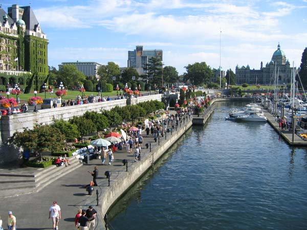![]() | フェリー乗り場を往復するバスターミナル前。ビクトリアは花、花、花で観光客をなごませてくれます。正面に見えるのはオ−ルドスパゲティファクトリーです。(ここのスパゲッティはおいしかった!)車が往来を通っていてもちっとも排気ガスの匂いがしないというのが欧米の良さです。日本はかなり立ち遅れています。 |