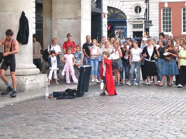 | コベントガーデンにさしかかると 広場には人だかりができていて、 大道芸で盛り上がっていました。 反対側ではジャズが、奥ではクラッシックが 向こうでもまた別の大道芸と、 たいへんなにぎわいでした。 |
