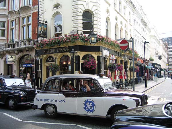 目の前をイギリス名物のタクシー(後部座席が向き合っている)が次々に通っていきます。