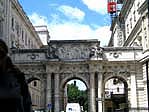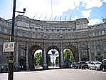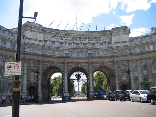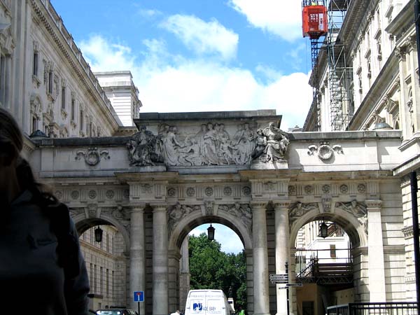 | 海軍門 この向こうにバッキンガム宮殿があります。 門の向こうの車道の脇は広い歩道と長い並木道が 続いていて、厳かな雰囲気がただよっていました。 この門はラテン語で書かれていたので読めなくて、 実際なんの門なのかは帰国してから知りました。 |
