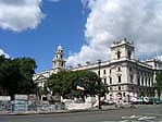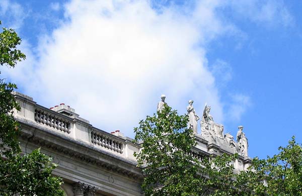 | ホワイトホール通りの政府庁舎です。 ちなみにホワイトホール通りは官庁街です。 ホワイトホール宮殿があったらしいのですが、17世紀に焼失したそうです。 真ん中は外務省の門かと思いますが違ったらごめんなさい。 彫刻も青い空に映えています。 |