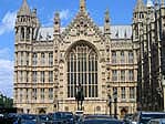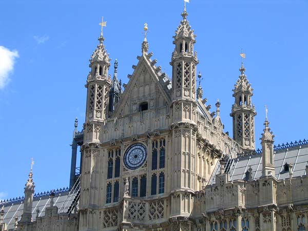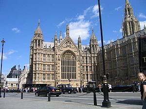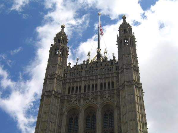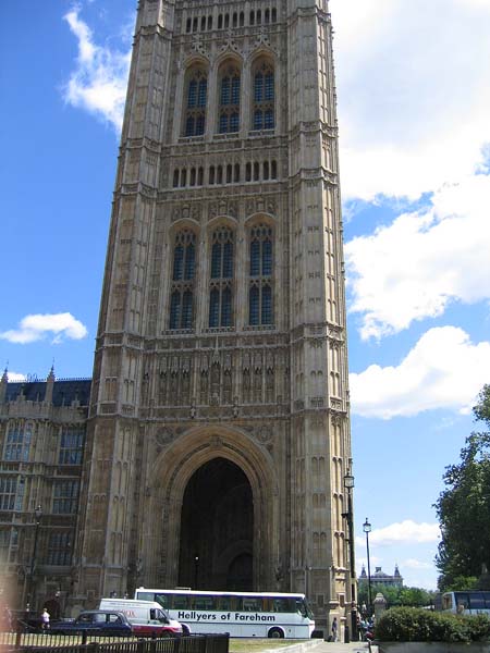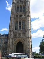←の中央の棟の拡大写真 → 国会議事堂の右端にある ビクトリアタワー あまりにも高くて 写真には収まり切れません。 ビッグベンと対のように そびえ立っています。 ビッグベンより高い98mです。 |