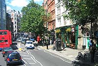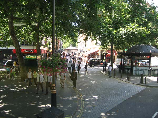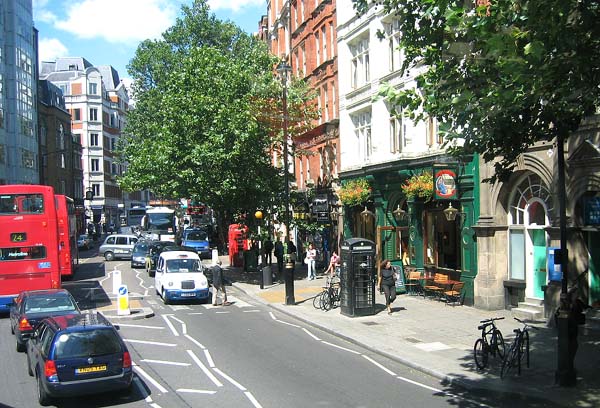 | ダブルデッカーの 2階席で撮った 街並みです。 右端の円形の建物は キオスクです。 |