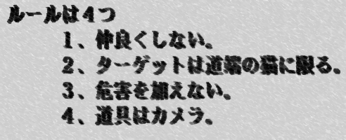 0202 柵の向こうから顔をのぞかせている猫を発見。 カメラをかまえ、のぞく。むこうもこちらをじっと見る。 シャッターをきろうとすると、ひっこむ。 ちっ! と思って、カメラから目をはずすと、 にゅぅと顔を出してのぞく。 あわてて、カメラかまえる。 もう、ファインダーのぞかずにシャッターをきる。 じっと、こちらを見る。 善人づらで近づいて、にゃぁーなどと言ってみる。 また、にゅぅと顔を出す。2匹いるのだ。 2匹ならべた顔をとる。 にゃぁにゃぁ言っていると、ひくひく反応する。 出てこいよ、と猫語で語りかけた(つもり)。 通じた!(妄想癖ぎみ)。 後から顔をのぞかせたヤツが、 にゅるぅーっと出てきたところをカメラで捕獲。 |