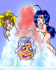 | かき氷の中で戯れるキャラというのは最初から決めていましたが、「セラムン」5人娘(月火水木金)は、数が多いし、ポーズが描きにくい。結局「小っちゃい」女神さまっをそのまま使いました。複雑な髪形が面倒でした。けっこういいかげんに描いた(^_^;)。かき氷は、「Color It!」の「ラバー」というプラグインの「ピクセルストーム」機能でフィルタ処理して、氷に赤いシロップが溶けるブツブツのザラ目感を出しました。 | ||||