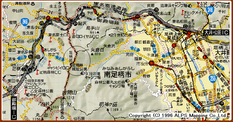 南足柄市矢倉沢と静岡県小山町の県境に位置する標高759メートルの峠は 足柄峠と呼ばれ、峠を含む付近一帯を足柄山という。 奈良時代、都を出、東海道を坂東へ向かう旅人は、この足柄峠を越えていた。 当時の旅人たちは、箱根越えの難路をさけて、箱根北端を通る足柄道が開かれ てからは遠回りであっても、標高が低く直線コースであることから足柄道を多 く利用していた。中世になると、この峠が要害の地であることから、大森信濃 守氏頼によって足柄城が築城され、現在の静岡県三島から箱根峠越えを発展さ せた。江戸時代には、矢倉沢往還が通るようになり、駿河(現在の静岡県)、 甲斐(現在の山梨県)方面から江戸への物資輸送路としてにぎわい、東麓に矢 倉沢関所、矢倉沢継立場が設けられた重要地点であった。