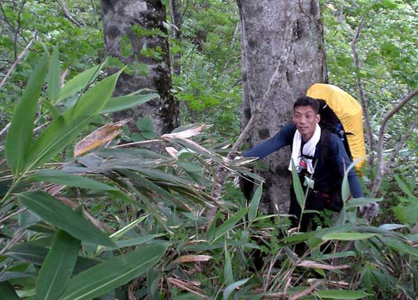 | 何とか険悪な崖を突破し、急な泥壁の窪地を登る。詰めは余りに急で、ピンソールも歯が立たない。猛烈な笹薮に逃げ込み、登りきると、標高770mコルに達する。大川と赤石川の尾根に林立するブナの巨木とまずは突破記念の撮影。ここから窪地を下り石の小屋場沢へ。下降は一ヶ所だけザイルを使用したのみで、難なく突破。 | |