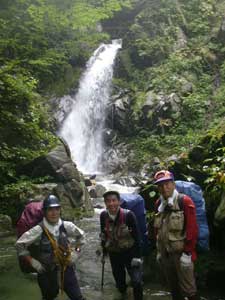| 今回のメンバーは、左から中村会長、高橋コック長、長谷川副会長、そして写真を撮っている私の4名。狭い両岸に轟音を発して流れる大滝は、何度見ても迫力がある。滝の傍では、瀑風で休憩などしていられない。その下流の河原で遅い朝食をとる。 | |