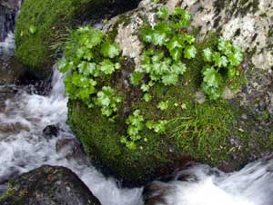 | 沢沿いの岸壁に生えた苔や草花・・・沢沿いには、岩や岸壁、倒木、巨木の根元などに多種多様な苔が生えている。星型のちょっとオモシロイ苔に注目。湿った苔には、多種多様な草花が生え、共生の美を形づくる(北海道日高)。 | |
