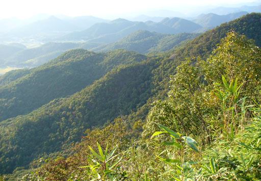露岩に行くと、まだ生い茂った木々の葉の向こうに六甲の山並み。