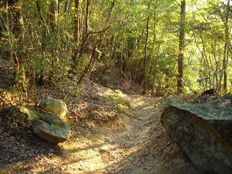 西日は六丁峠の下にも射して、黄緑のシャワーの中。