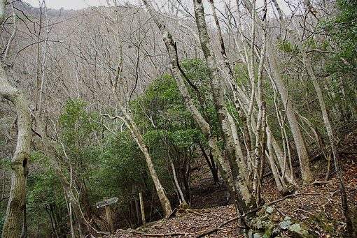 短い檜林を登った先には、文字が消えて判読できない道標とロープがあった。まだ、ロープに頼るほどではない落ち葉の