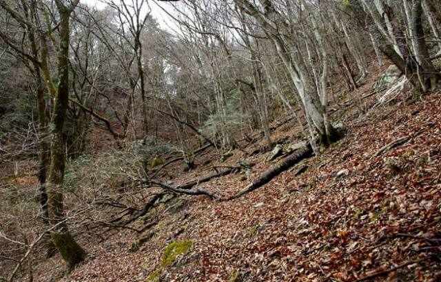 のっぺりとしている。木に掴まりながら枯れ葉の坂を登って行くと背後に山頂の尾根が出てくる。