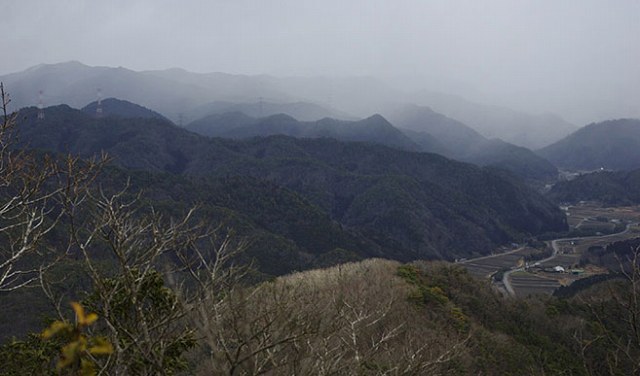しかし、雑木が邪魔してもう一つスッキリしない。小柿の谷や羽束山が認められる。木々の向こうに大船山の影。