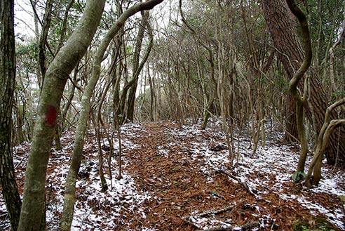 少し五月蠅い低木ヤブが続いて植林に入り、荒れた峠道に下りる。