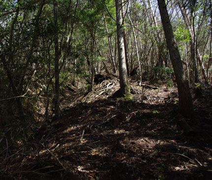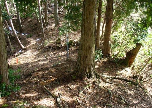 緩やかな尾根は再び急登となる。立木を捕まりながらの登りが続く。たまに残置テープがある。左手に堀が現れて来た。