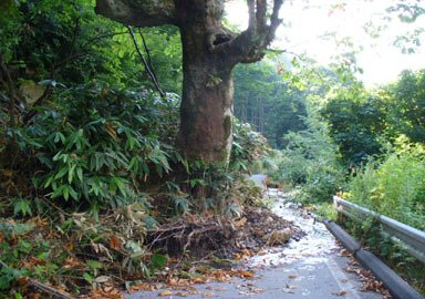もう一つ驚きは、大きな栃の木ごと斜面から落ちてきて道をふさいでいた。1m幅の隙間を通るが、