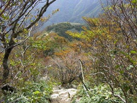 帰路はゆっくり道を踏みしめ花や紅葉しかけの山道、ガスの流れる尾根を眺めて行く。