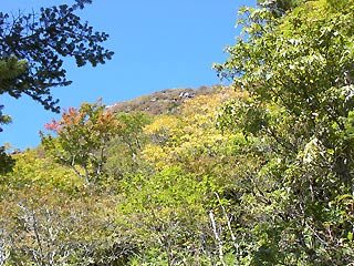 少なくなって、石が多くなってくると頭上に大きな岩がせり上がっている。わずかに黄葉した葉を