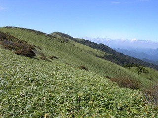 【ササヤブ】 広々としたササの稜線を下る。二つ目の丘は遠目には少し立ち木があるかと見えたが、