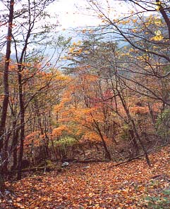 【黄葉の道】 風が冷たいなってきた。南を見上げると薊岳だろうか、誘うように