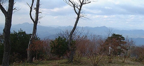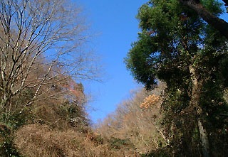 左右の尾根の上には抜けるような青空。枯れた雑木林が天を掃くようだ。