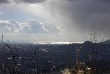 来ると展望も開けて日射しが戻る。西を見ると六甲の上に先程の雪雲が被さっている。