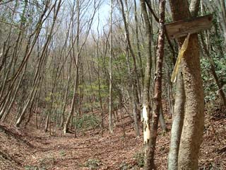 仕事道が分岐するが道標には×印。続いて急傾斜の雑木林の谷。尾根の東側を行くようになる。