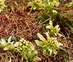 下りようとする、さっきの急降下斜面にふきのとうの群生。白っぽい黄緑の株が