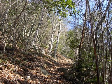 高さしか空間が無い。道脇は落ち葉の雑木林である。ただ低木多し。天気のいい尾根道を辿ると