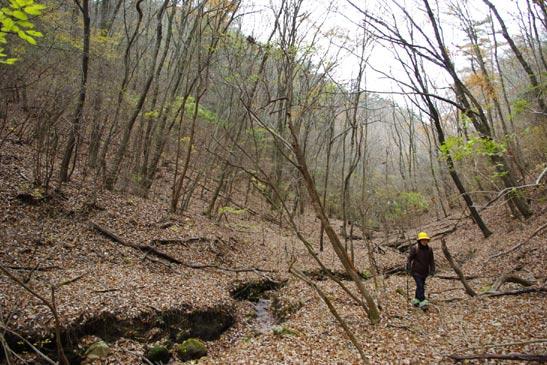 いよいよ雑木の谷が広がる。もう少し葉が残っているかと思ったがほとんど落ちてしまって明るい谷。