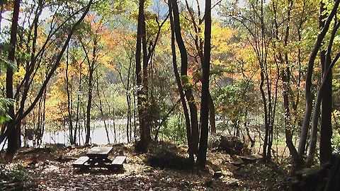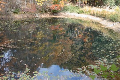 その静けさが水面に反射しています。黄葉の中で青い葉をまとった樫の大木を愛でて山をあとにした。
