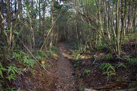 三角点への道もありそうだなと思い左折。古道は尾根を乗り越えて西面へ下りていくが尾根に向かう古道に出合う。