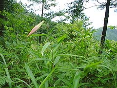 ■目的地:歌垣山(554m)<山域:北摂・大阪府能勢町> ■日にち:1998年6月6日(土) ■天気:曇り時々晴れ ■同行者:嫁さん ■コースタイム: 堀越峠 [約390m](10:15)〜山頂(10:40)〜北のピーク(10:50-11:00)〜 山頂〜堀越峠(11:30) 【歌垣山】 妙見山の北にある私のお気に入りの山の一つ。 栗の花の香りが漂ってくる季節になりました。子供の頃ならクワガタ取りを 想いますが、最近はササユリです。 今年の春は花が早かったので、もう遅いかなと覚悟して行ってみました。 そんな、たいそうなもんでもないですが...。(^^) 【木の階段に一輪】 お手軽な堀越峠からのピストンです。府道脇の木の階段を えいえいと登っていきます。鳥の声がして山の雰囲気に包まれてきました。階段が 途切れたところでいきなりササユリ一輪。おぉっ、もう咲いとる。この分じゃ上の 方は花だらけかなぁと、期待がふくらむ。家事に忙しい嫁さんを連れ出してきたので たくさんあるといいのだが...。道ばたをきょろきょろしながら登る。 【あとはツボミ】 ペリカンのくちばしのようなツボミはポツポツと見かけるが、 花はなし。途中、単独おじさんやおばさん二人連れにあう。お目当ては同じ。 とうとう山頂まで到着。三角点北の松林の下草が以前よりも広い範囲で払われていた。 北のピークの休憩所にも行ってみる。ここにもおじさん一人。下りでは夫婦連れに 会う。今日は人は多いが、花はもう少し後のようです。