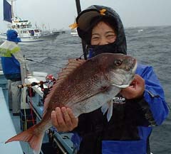 9時半、気が付くと嫁さんがヤリトリしている。「ダンナァ、よく見てないとさぁ」と船長。それなりに竿も曲がり、時折軽くドラグを滑らせてあがったには黒いオス。後検量2kgの良型(本日最大級)である。嫁さんのマダイ連敗記録更新にストップをかける快心の1枚であり、嫁さんは大喜びである。聞けば仕掛けはPEマダイ8号にハリス3号9ヒロとのこと。潮上での長ハリス作戦があたったのであろうか。
