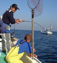 この後、平川さんもワラサを掛けるがタモ取り時にバラシ。更に左舷トモでオマツリしながらも同級のワラサが取り込まれた。なるほど、噂どおりワラサの魚影も濃いようだ。