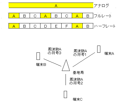 ハーフレート方式では更に圧縮率を高くし、同じ25KHzの帯域で6回線分の通話が出来るようになります。