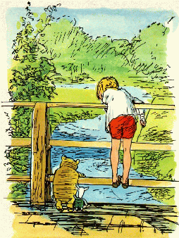 橋のこちらで枝を投げて、急いで橋の反対側へ行ってのぞきこみ、2人の棒のどちらが早く流れてくるかを競う遊び