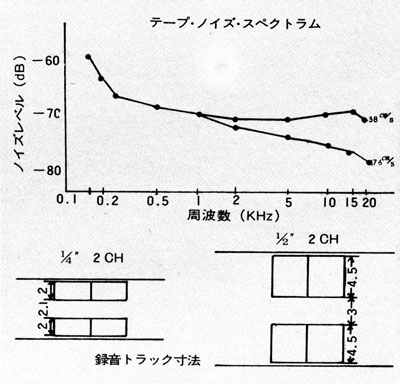 1/2インチ 2 CHANNELは、ワイドなトラック幅で3.5dBノイズがよくなっていますから、トータル10kHzで12.5dBもの改善がなされているわけです。