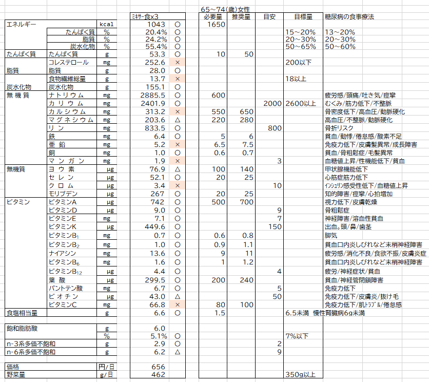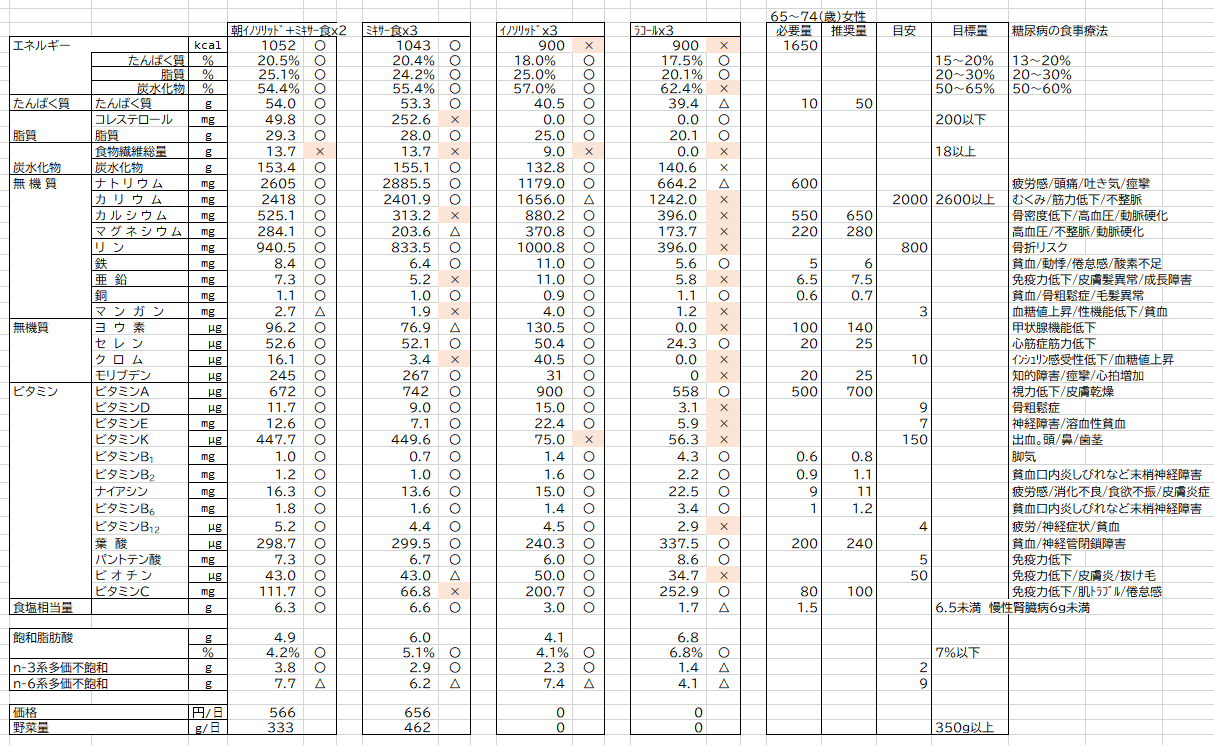 すべての栄養素について目標値と計算をしてみました。