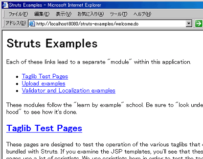 http://localhost:8080/struts-examples/ にアクセスして確認してみる。