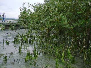 ここでは、過去台風の都度に高潮によって、海岸が流され、大変な被害を受けてきた経験から、海岸にマングローブを植え、海岸の保全をはかるとともに、稚魚の生育域をつくり、漁業にも役立てようとしている。