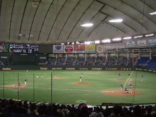 関東地方を襲った降雪のため、試合が開催されるのかどうかとても不安だったが、無事開催されました。19時開始の試合、始球式は松岡の投球をゴジラが打ち、メカゴジラがジャッジする趣向。松岡がお約束通りゴジラを打ち取り、ゴジラは火ならぬ煙を吐いて退散。